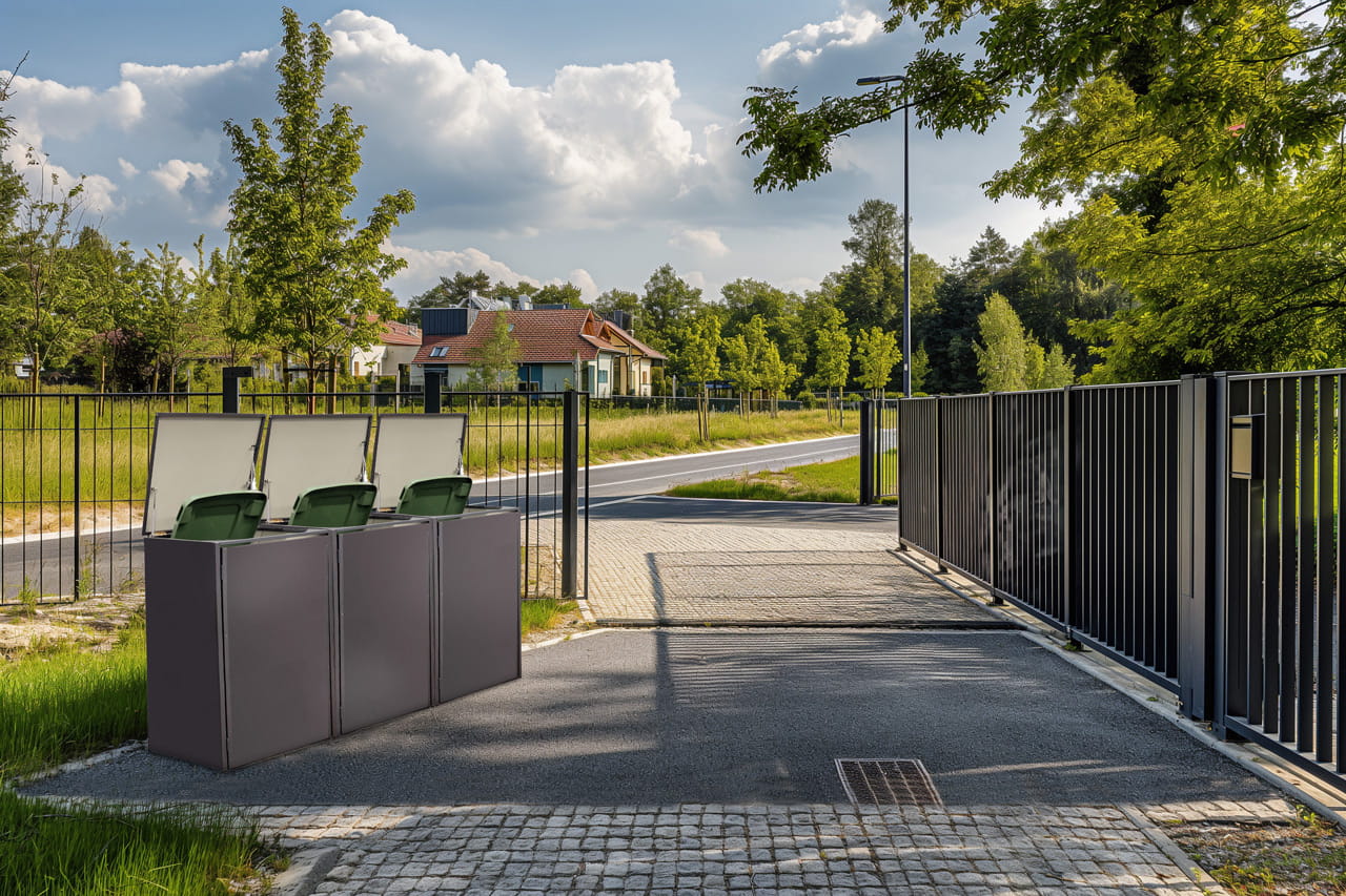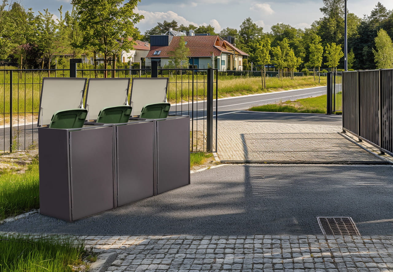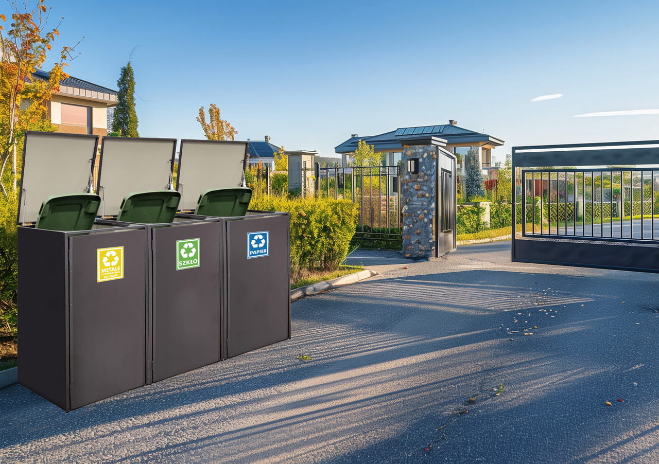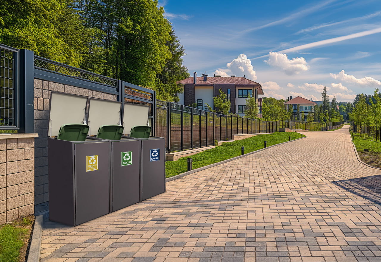 Potrójna zabudowa koszy na śmieci marki RattanArt o wymiarach 192x57x113 cm to eleganckie rozwiązanie problemu nieestetycznych pojemników na odpady. Konstrukcja w modnym kolorze Antracyt (RAL 7016) pozwala estetycznie ukryć trzy kubły 120L, tworząc spójną całość z nowoczesnym ogrodzeniem i elewacją budynku. To idealny wybór dla osób segregujących odpady (np. plastik, papier, szkło), które chcą zachować nienaganny wygląd podjazdu lub ogrodu.